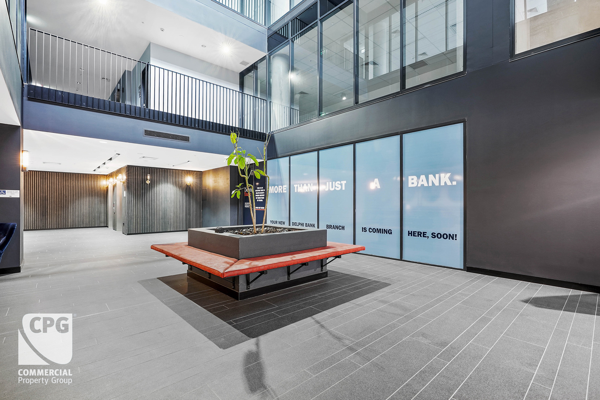 – On-site cafe, large prominent entrance lobby with soaring atrium